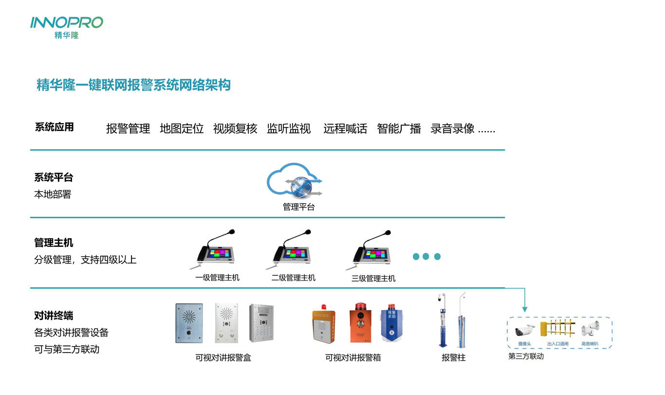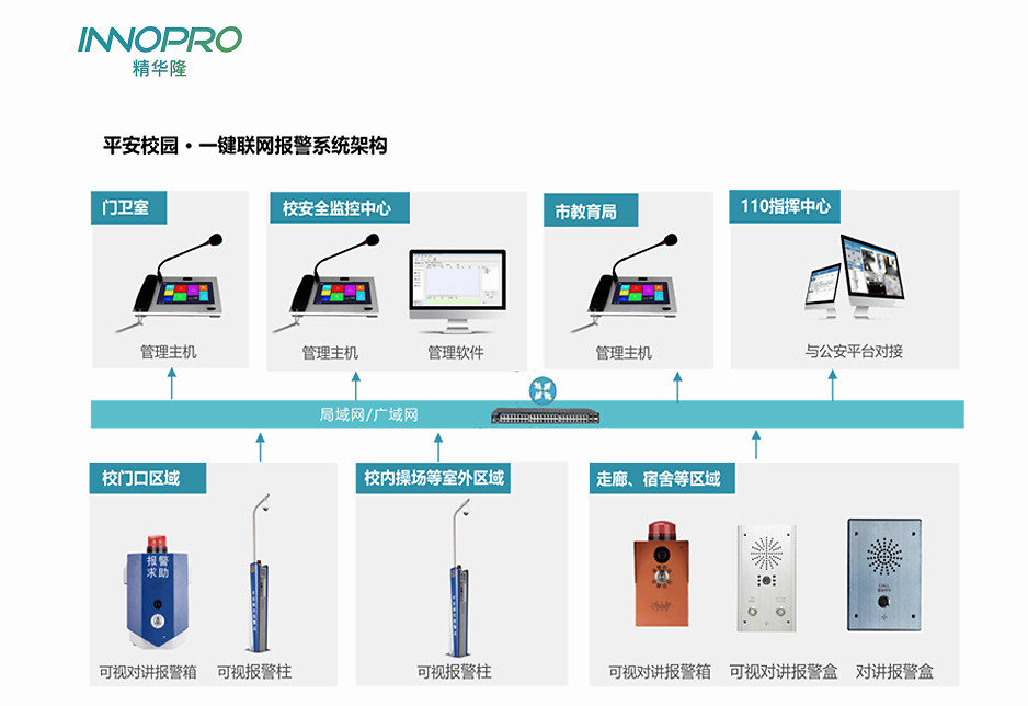 INNOPRO精華隆一鍵聯(lián)網(wǎng)報(bào)警系統(tǒng),除了用于校園外,還廣泛用于醫(yī)院、景區(qū)、公園、銀行、軌道交通、看守所/監(jiān)獄等平安城市建設(shè)場(chǎng)景。